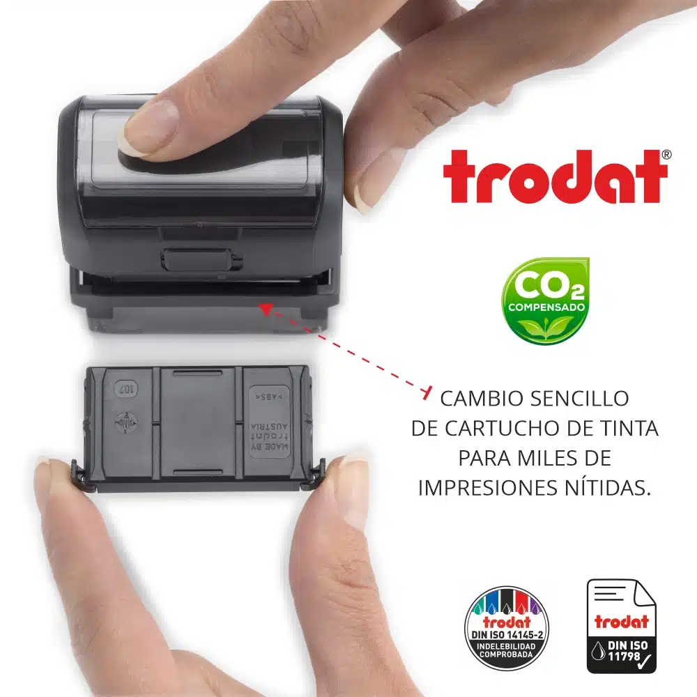 El Trodat 4912 está diseñado para durar años. Su mecanismo de deslizamiento suave evita el desgaste prematuro de las piezas móviles. Además, cuando la tinta se agote, el proceso de cambio es el más limpio del mercado.